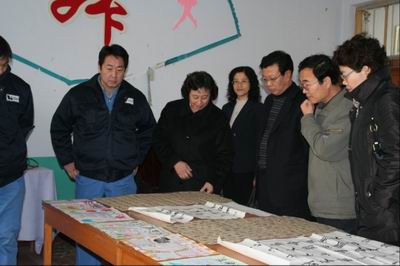 图为:市政协副主席、市慈善总会副会长苑星莲女士(左二)陪同日方代表参观聋哑学校学生作品.