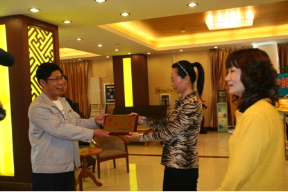 图为:市老龄办主任、民政局党委副书记、慈善总会副秘书长王本宾同志为速8酒店胶南恒力源店颁发获奖牌及荣誉证书