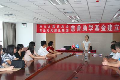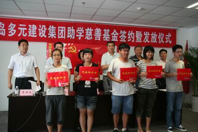 8月23日上午,胶南市慈善总会青岛多元建设集团助学基金签约暨助学金发放仪式在青岛多元建设集团举行。青岛多元建设集团与胶南市慈善总会签约建立了1200万元的多元慈善助学基金,并为我市15名品学兼优的贫困家庭大学生发放了助学金。同时青岛多元建设集团计划在我市共循环资助30名品学兼优的贫困家庭大学生,帮助他们顺利完成大学学业。