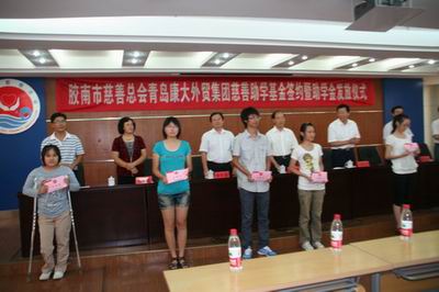 826上午,胶南市慈善总会在市民政局五楼会议室举行青岛康大外贸集团慈善助学基金签约暨助学金发放仪式,并为我市100名贫困家庭的大学生发放了助学金。