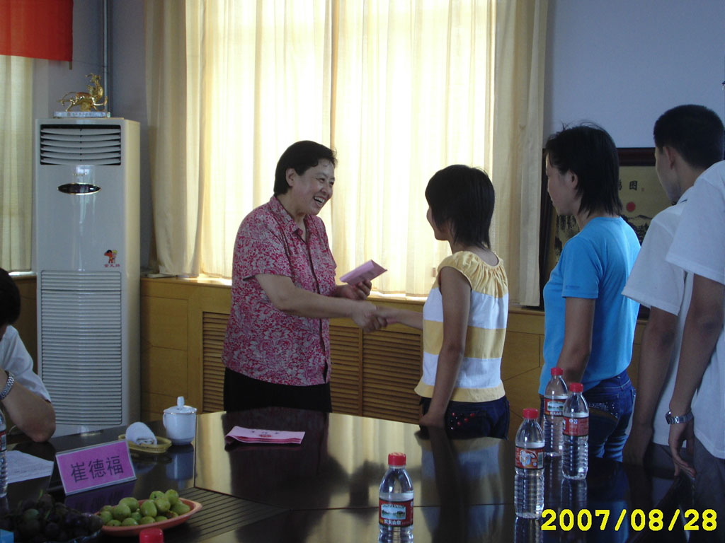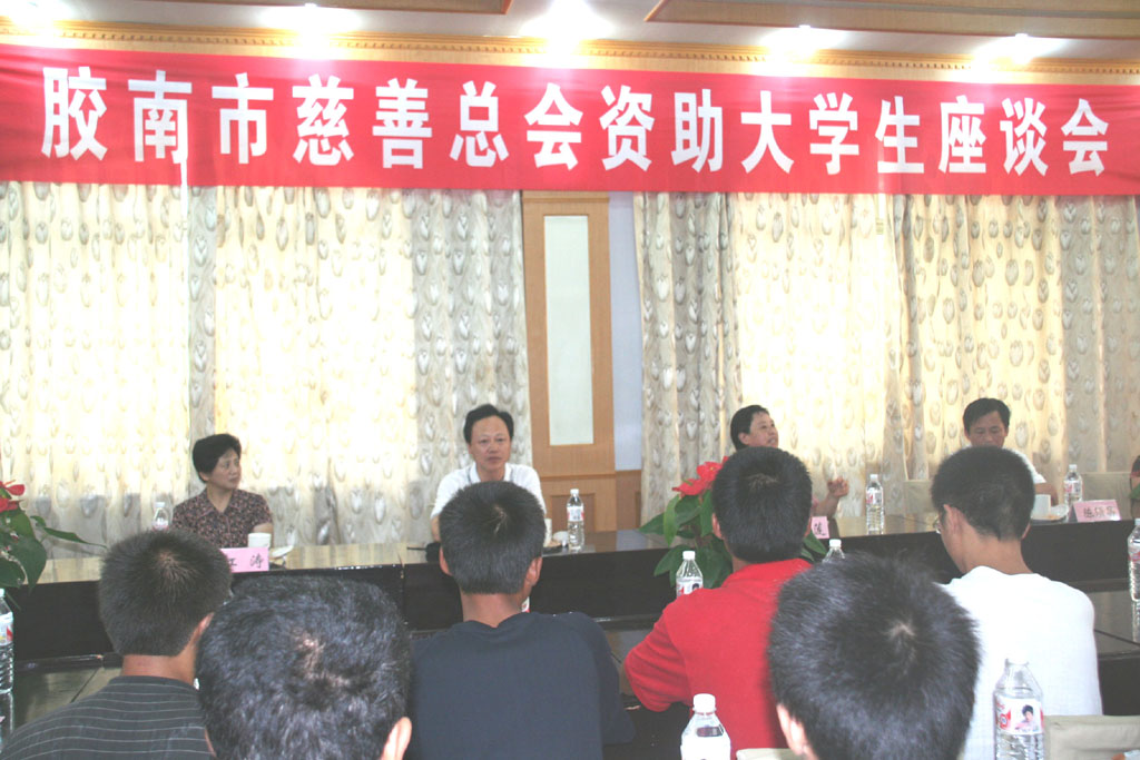 8月28日,胶南市慈善总会分别在该市的第二中学和第五中学召开了2007年度资助大学生座谈会。座谈会上,该市市委常委、副市长、慈善总会副会长杨东亮和市政协副主席、慈善总会副会长苑星莲先后代表慈善总会将装有银行卡的助学金袋分别发放到受助学生手中,这样既保证了资助金的安全,又方便了学生们报到缴费注册。杨东亮和苑星莲在座谈会上都发表了热情洋溢的讲话,他们在讲话中介绍了慈善总会近年来的慈善助学行动为解决贫困大学生入学难题、构建和谐胶南作出的积极贡献;对大学生们提出了殷切希望:希望他们家贫志不贫、奋发图强、认真学习、不断进取、不断提高自身的思想道德素质和科学文化素质,早日成材,回报党和国家的培育之恩和社会的厚爱。