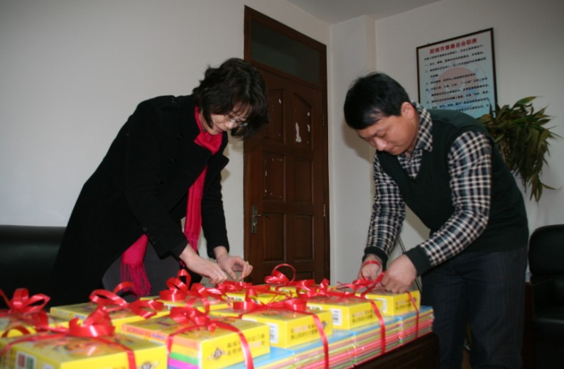 图为:市慈善总会工作人员用红丝带精心捆扎幼儿辅导丛书