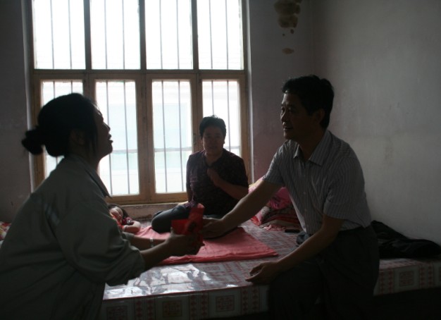 图为:胶南市慈善总会副秘书长王明恩(右)走访慰问宋宇睿一家